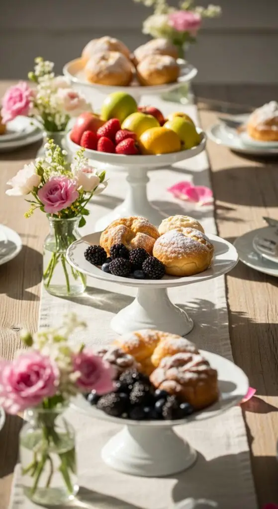 Because vintage cake stands instantly alter flat table surfaces into mesmerizing displays, I use them strategically throughout my spring brunch setups to draw the eye upward and create visual layers. I vary cake stand heights by combining tall pedestals with shorter ones, creating multifaceted arrangements that guide guests’ attention naturally across the table.