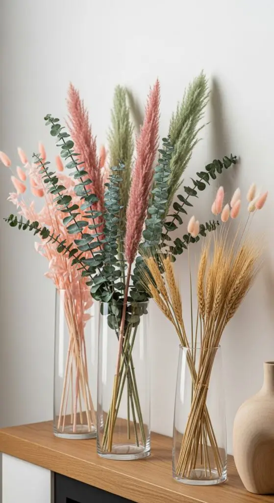 Dried florals offer lasting beauty without the maintenance demands of fresh flowers, making them perfect for busy spring decorators. I recommend selecting eucalyptus, pampas grass, and wheat stems in soft pink, sage green, and cream tones for your muted color palettes.