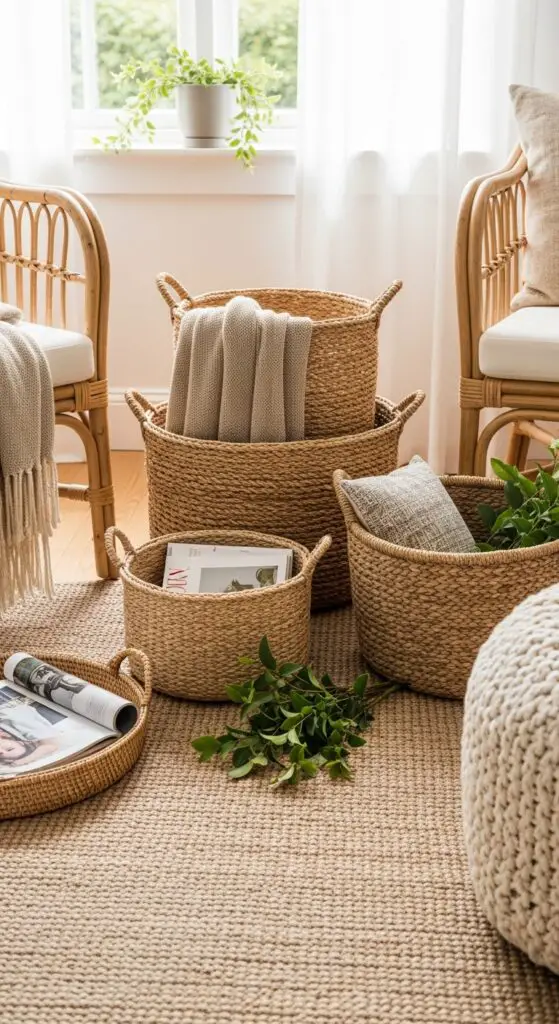 Add Natural Textures Through Woven Baskets and Jute Rugs