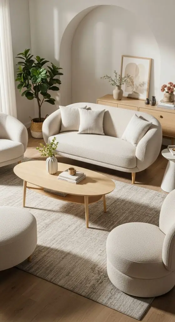 Opt for oval shaped coffee tables instead of sharp-cornered alternatives to enhance the soft aesthetic. Round ottomans and kidney-shaped accent chairs complete this fluid look, converting your space into a serene spring sanctuary. This approach creates a living room atmosphere that feels both refreshing and naturally inviting.