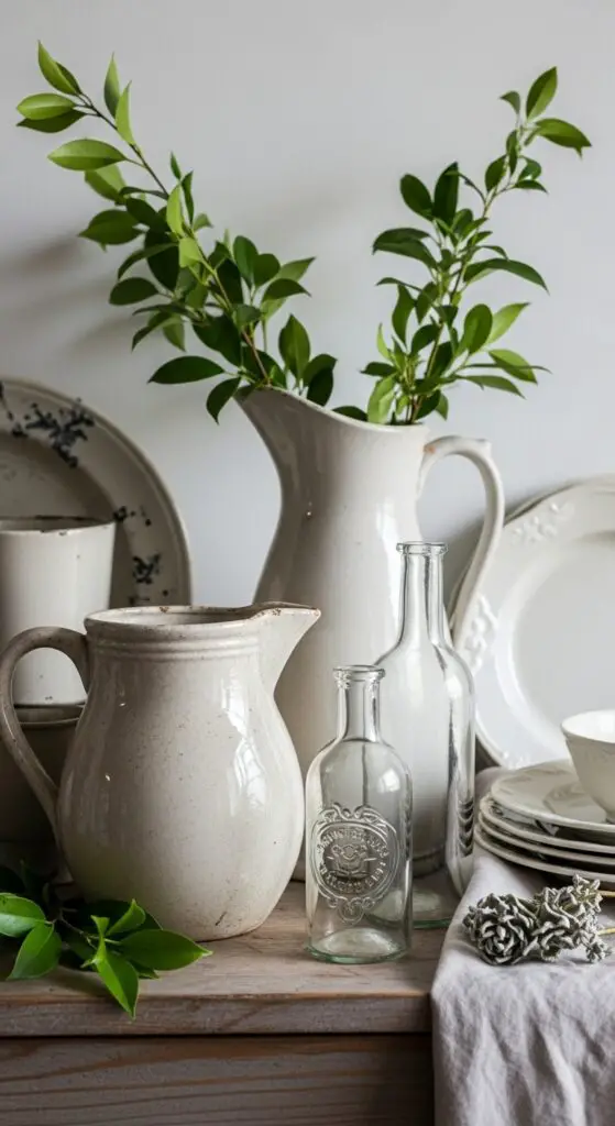Start by selecting pieces with varying heights and textures – perhaps a weathered ceramic pitcher alongside delicate glass bottles. When you arrange vintage dishware collections, layer different sizes and complement muted tones with fresh greenery. Position your tallest piece in back, medium-height items to one side, and smaller accents in front to create visual triangle compositions that feel balanced yet organic.