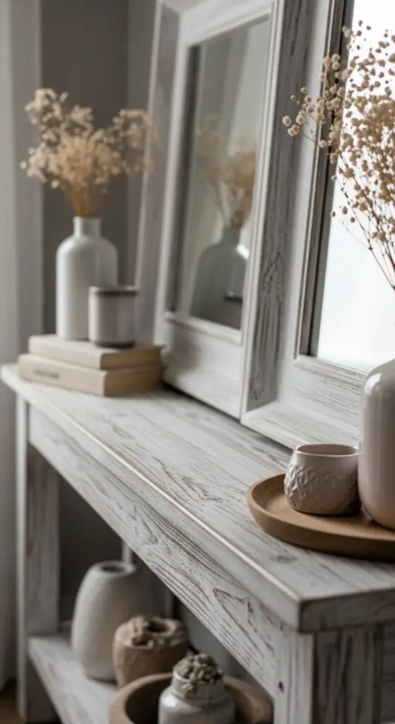 Painted whitewashed furniture serves as the perfect foundation for your seasonal refresh. Consider adding a whitewashed console table or weathered wood mirror to anchor your room’s design. These pieces offer the freedom to layer different textures without overwhelming your carefully curated vintage collections.