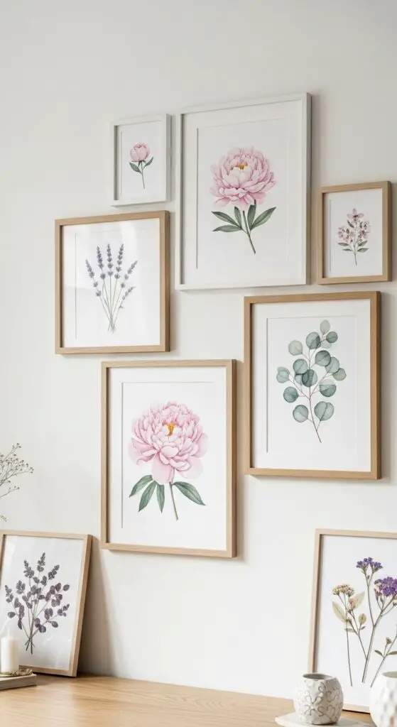 When you display framed floral artwork, group three to five pieces at varying heights for lively visual flow. Consider mixing watercolor botanicals with pressed flower displays to incorporate natural materials in decor. Choose frames in light wood tones or crisp white finishes that won’t compete with the artwork’s soft aesthetic.