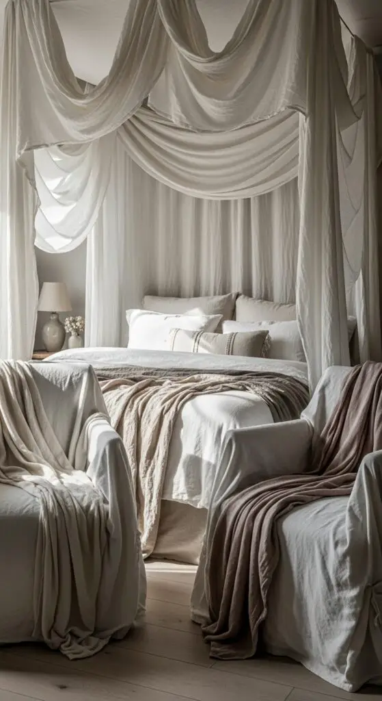 Flowing fabrics instantly alter any room into a dreamy spring sanctuary that feels both luxurious and effortlessly romantic. I recommend starting with flowing linen canopies over beds—they create intimate spaces while maintaining that breezy, untethered feeling you’re craving.
