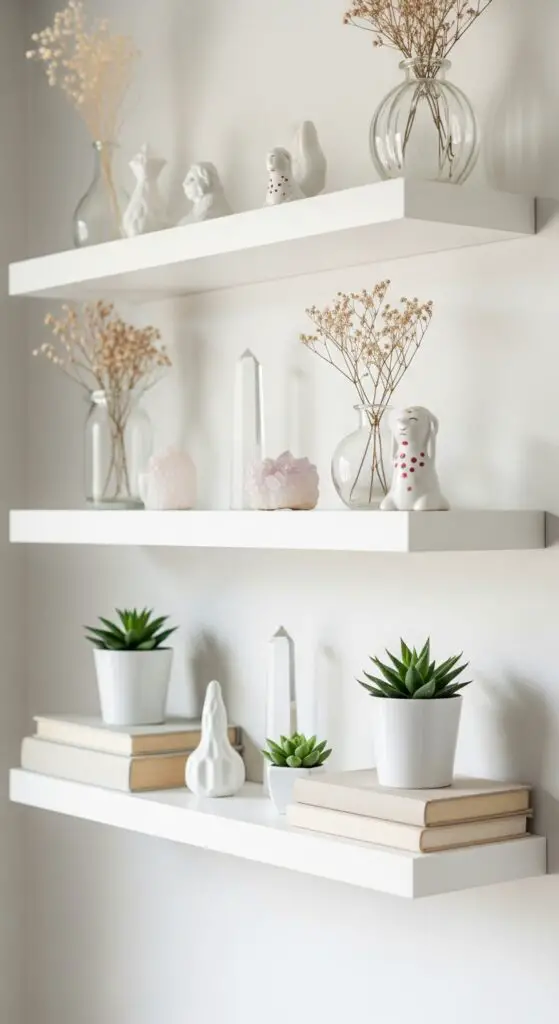 Start with varying heights using small glass vases, ceramic figurines, and delicate crystal pieces. Place taller items toward the back, creating depth and layering. Add dried flowers in neutral tones alongside small potted succulents for organic texture. Include one statement piece per shelf to avoid overcrowding. Light-colored books can serve as risers, elevating smaller decorative elements while maintaining that dreamy spring atmosphere you’re creating.