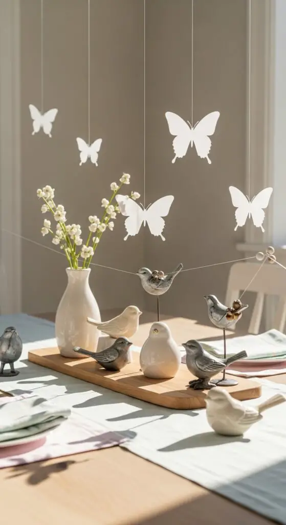 Delicate bird figurines work beautifully as centerpiece accents or perched along windowsills. Mix different sizes and materials—ceramic, metal, or wood—for dimensional interest.