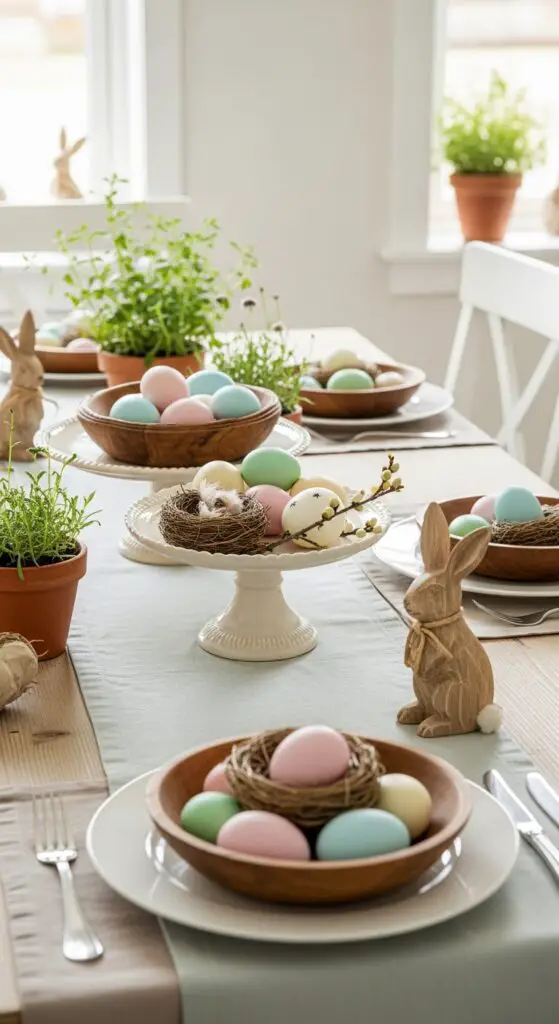 Nature inspired place card holders add personal touches to each setting. Try using small potted herbs, miniature bird nests, or carved wooden rabbits to hold guest names. These charming details alter ordinary meals into festive celebrations your guests won’t forget.