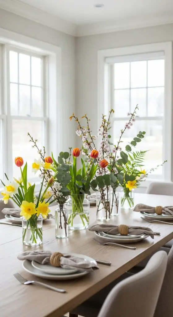 I recommend selecting fresh blooms like tulips, daffodils, or cherry blossoms for maximum seasonal impact. You can create stunning minimalist floral arrangements by choosing one flower type in varying heights and grouping them in simple glass vases.