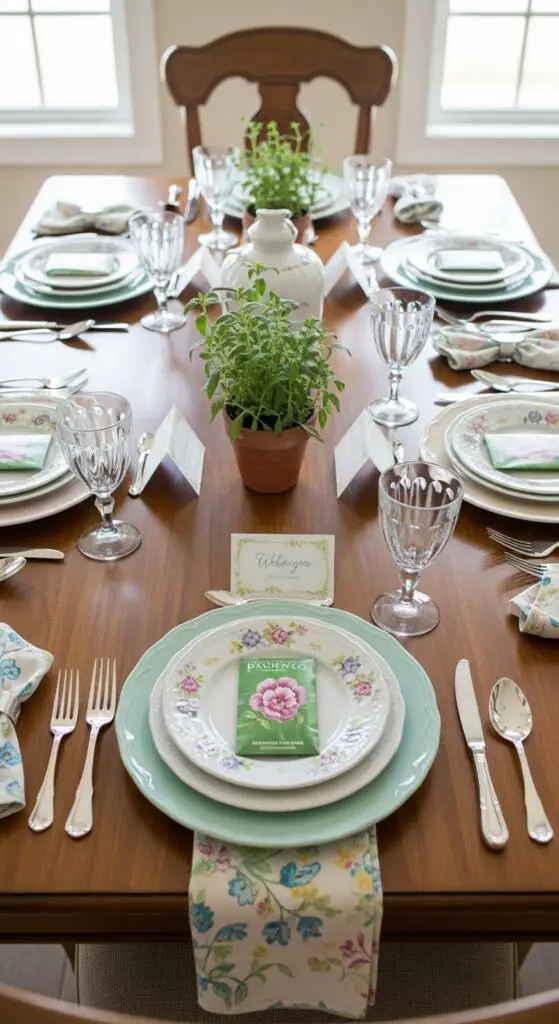 Complete your tablescape with charming place card displays featuring guests’ names on seed packets or small potted herbs they’ll take home as favors. These spring table decor ideas work beautifully for both everyday dining and special occasions throughout the season.