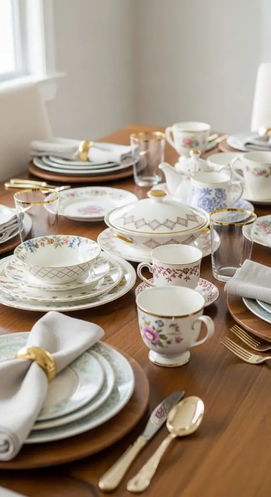 Hunt for antique serving pieces at estate sales and thrift stores. Mix gold-rimmed plates with hand-painted bowls, creating an effortlessly collected-over-time aesthetic that guests adore.