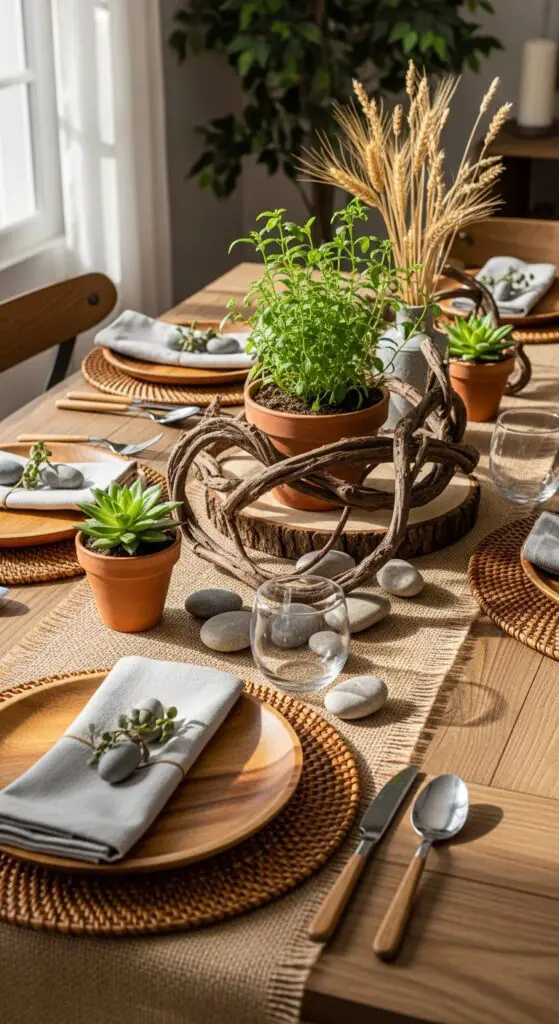 Start with rustic wooden trays as your foundation, then layer woven placemats or burlap runners for texture contrast. Add potted herbs, twisted branches, or smooth river stones as centerpiece elements that speak to nature’s simplicity. The key to achieving this look lies in incorporating soft tones that complement the natural wood elements and create a cohesive spring atmosphere.