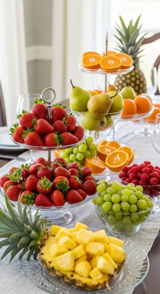 I arrange colorful citrus wheels, green grapes, and ruby raspberries in glass bowls at varying heights for visual depth. These seasonal produce displays eliminate waste while adding natural beauty to your table.