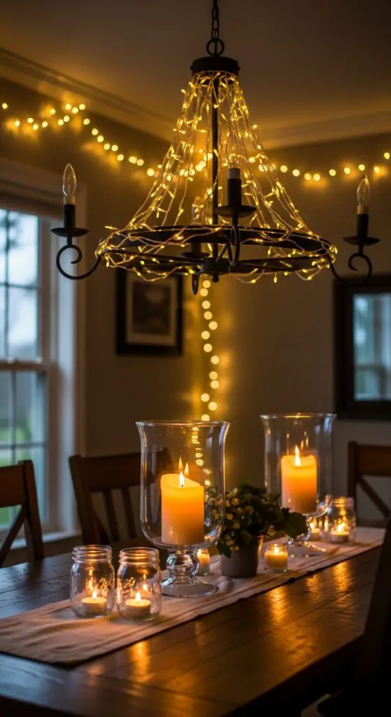 The golden glow of string lights remodels any dining room into a magical evening retreat where conversations linger and memories unfold naturally. I recommend draping warm white LED strings along your ceiling’s perimeter or weaving them through a chandelier for subtle illumination. Battery-powered options give you placement freedom without cord constraints.