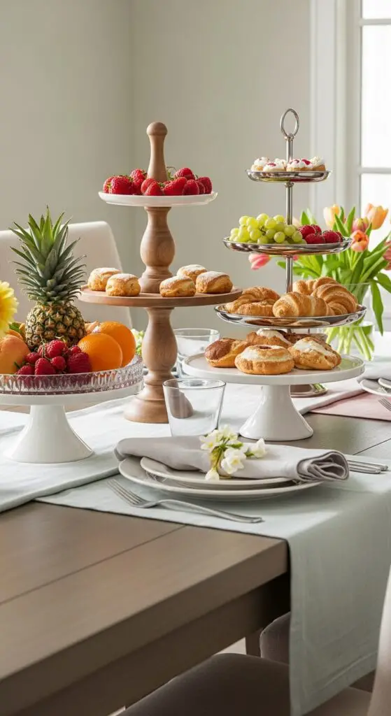 Start with a three-tier cake stand as your centerpiece foundation, then add smaller two-tier stands at different points along your table. Mix materials like glass, wood, and ceramic for textural variety. Place fresh fruit, pastries, or spring flowers on each level. These tiered arrangements create natural conversation zones while maximizing your serving space efficiently and stylishly.