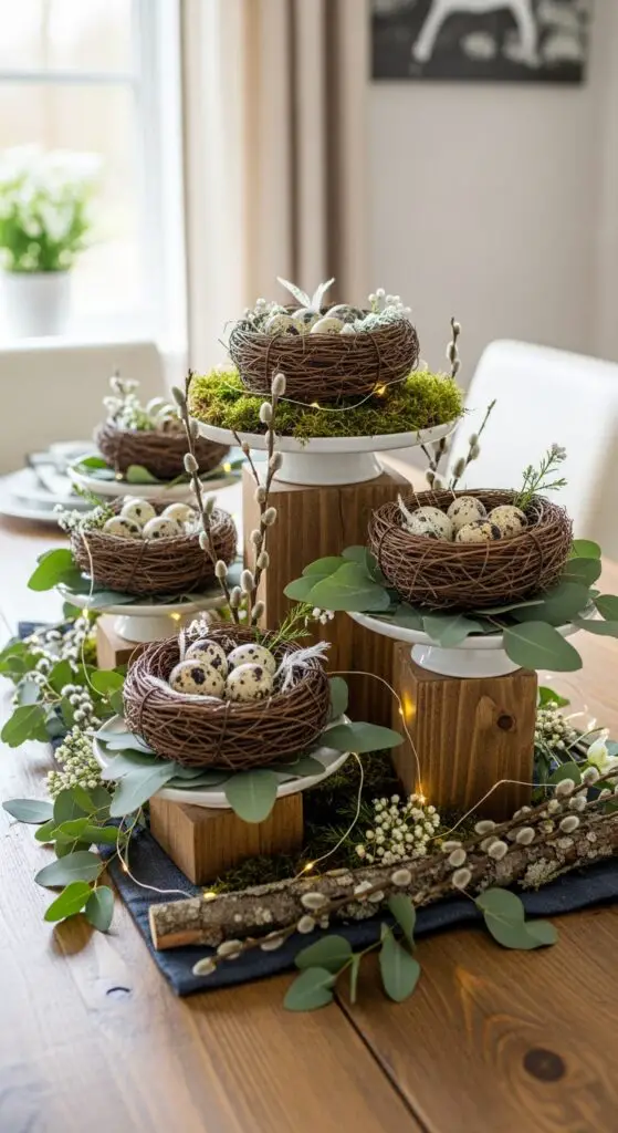 Position multiple nests at varying heights using cake stands or wooden blocks for visual interest. Add fresh greenery like eucalyptus or pussy willows around each nest. Consider incorporating floral touches alongside your nest displays to enhance the spring atmosphere. I suggest incorporating soft lighting with battery-operated fairy lights woven through the branches. This creates an enchanting woodland atmosphere that celebrates spring’s awakening perfectly.