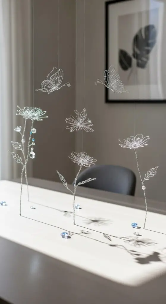 Start with 18-gauge craft wire to shape butterfly wings and flower petals, then add colorful beads or glass accents for visual interest. These fanciful metal insects can sway above your table when suspended from thin fishing line. Position multiple sculptures at varying heights to create depth and movement that’ll mesmerize your guests throughout the entire meal.
