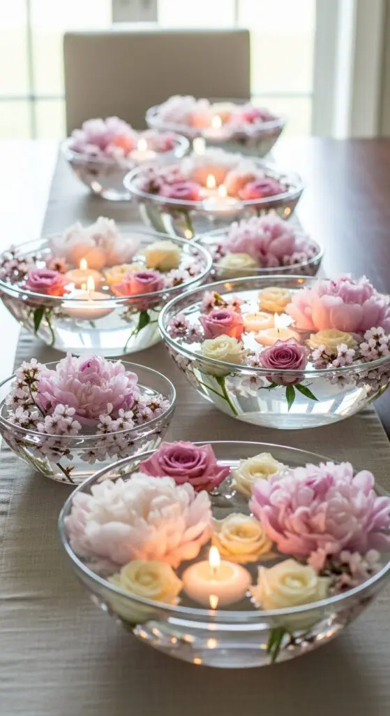 When you’re ready to add romantic ambiance to your spring table, floating flower bowls with candles create striking focal points that dance with light and color. I love how these floating candle centerpieces transform ordinary glassware into magical displays that captivate guests without overwhelming your table space.