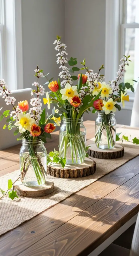 Fill each jar with fresh water, arrange flowers at varying heights, and group three jars together for maximum visual impact across your table. Consider incorporating vintage touches like weathered wood slices or burlap table runners to enhance the natural, rustic aesthetic of your spring tablescape.