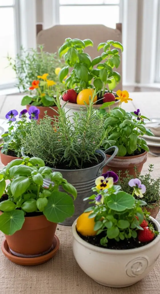 This approach lets you snip fresh herbs during dinner service while maintaining a refined centerpiece throughout your meal.