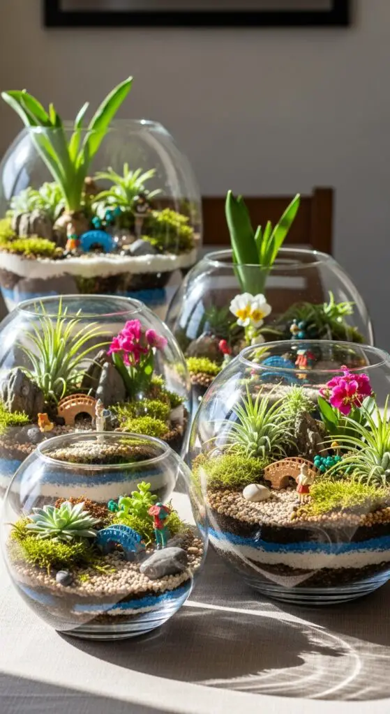Start with different-sized glass vessels to create visual depth across your table. Layer sand, pebbles, and moss as your foundation, then add miniature landscape sculptures like tiny bridges or figurines. Include small succulents, air plants, or spring flowers that thrive in enclosed environments. These self-contained gardens require minimal maintenance while offering maximum impact throughout your spring entertaining season.