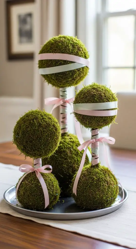 Start with foam spheres or cones, then wrap them completely in preserved moss using floral pins. Choose coordinating ribbon colors that complement your dining room’s palette—soft pastels for subtle charm or bold hues for dramatic impact. Wind ribbon around each topiary in spirals, securing with hidden pins.