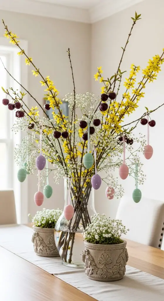 Start with tall branches like cherry or forsythia, placing them in weighted vases for stability. Thread thin wire through hollow plastic eggs in soft pink, lavender, and mint green pastel color palettes. Hang these at varying heights along your branches.