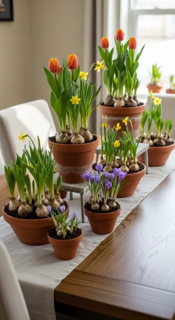You’ll create miniature spring gardens by grouping three to five bulbs of varying heights across your table’s center. Consider transferring bulbs from hanging baskets into decorative containers that match your dining room’s aesthetic. These living displays provide weeks of transforming beauty as blooms open and develop. For everyday dining, these potted arrangements offer the perfect balance of elegance and practicality.