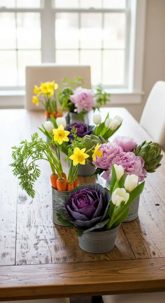 Nature’s bounty offers an unexpectedly charming approach to spring centerpieces when you combine garden vegetables with seasonal blooms. I love pairing baby carrots with their leafy tops alongside daffodils for vibrant color palettes that celebrate the season’s freshness.