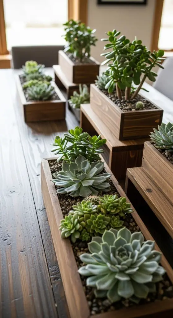 Choose rectangular wooden boxes with drainage holes, then layer gravel before adding cactus soil. Arrange different succulent varieties by height—place taller echeveria in back, shorter jade plants forward. These miniature succulent compositions thrive with minimal water and bright light.