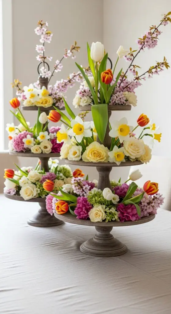Start with your tallest flowers on the bottom tier, then arrange medium-height stems on the middle level. Place delicate buds or petite blossoms on top for perfect visual balance. Mix tulips, daffodils, and cherry blossoms across multiple tiers for vibrant color contrast.