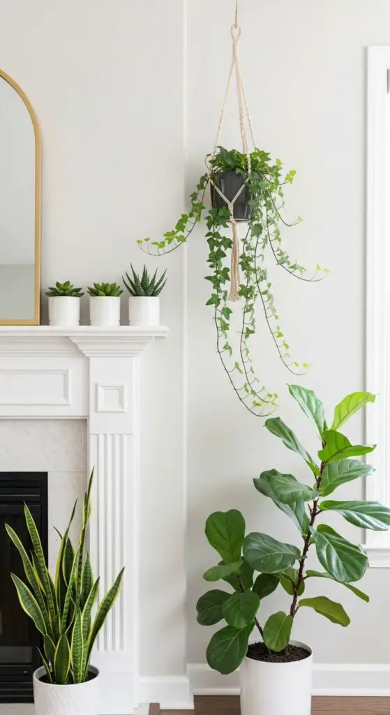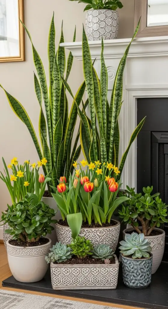 Place tall snake plants or fiddle leaf figs in back corners, then add medium-sized spring bulb plantings like tulips or daffodils in decorative containers. Complete your display with a potted succulents arrangement featuring jade plants and echeveria in varying pot sizes.