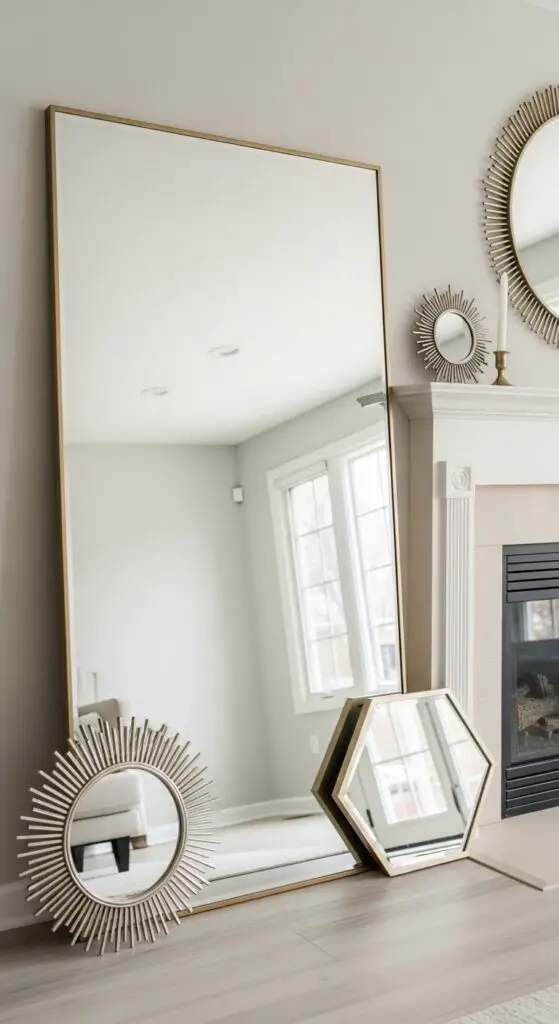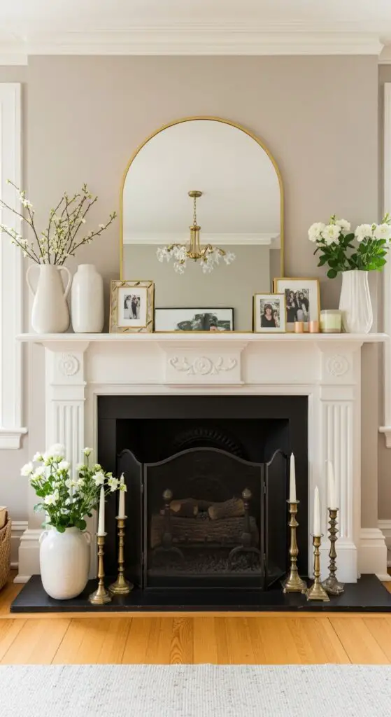 Don’t limit yourself to traditional rectangular shapes—utilize unique mirror shapes like sunbursts, hexagons, or vintage-inspired designs that complement your spring aesthetic. Lean oversized mirrors against the mantel or mount smaller ones in clusters for fluid visual interest that alters your fireplace into a luminous focal point.