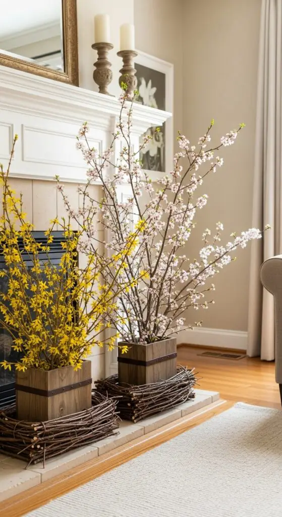 I’ll gather flowering branches like forsythia, cherry, or apple blossoms and arrange them in rustic wooden planters placed directly on the hearth. These containers add warmth while showcasing nature’s beauty. I enhance the display by incorporating natural twig accents around the base, creating depth and texture.