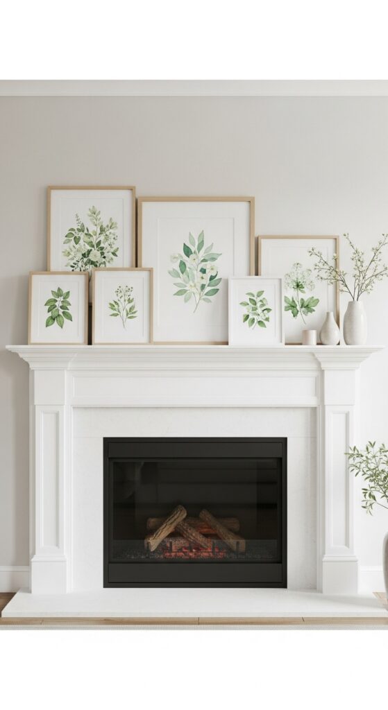 The artwork you choose above your mantel sets the entire room’s spring mood and creates a stunning visual anchor for your seasonal alteration. I recommend selecting framed nature prints featuring blooming trees, meadow sceneries, or forest vistas that bring outdoor freshness indoors. Seasonal floral artwork works beautifully too—consider watercolor botanicals, vintage flower illustrations, or contemporary abstract pieces in soft spring colors.