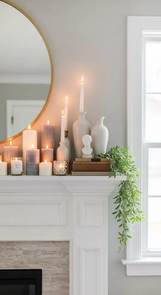 Several strategic placement techniques alter a flat fireplace display into a vibrant focal point that draws the eye upward and across the entire mantel area. I’ll show you how staggered candle displays create natural height variation when you arrange pillars, tapers, and votives at different elevations.