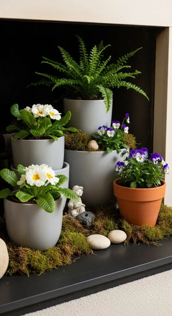 Potted plants revive your unused fireplace into a lively garden sanctuary that celebrates spring’s natural beauty and rebirth. I recommend creating layers with different plant heights and textures to maximize visual impact.