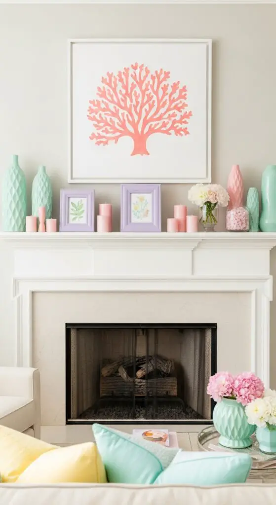 Soft pastel hues metamorphose your fireplace into a welcoming spring focal point that captures the season’s gentle energy. I recommend strategically placing pastel decorative elements like mint green vases, blush pink candles, and lavender picture frames across your mantel.