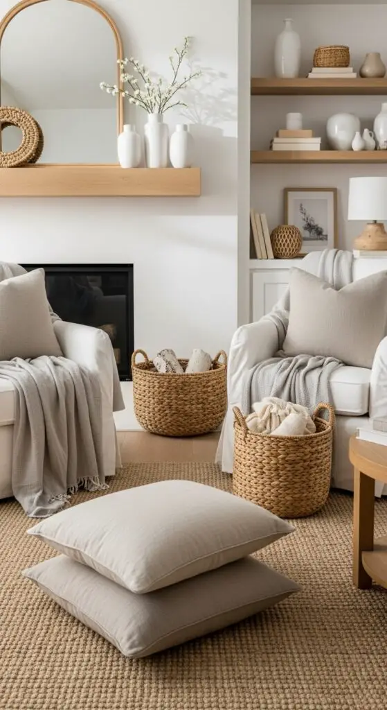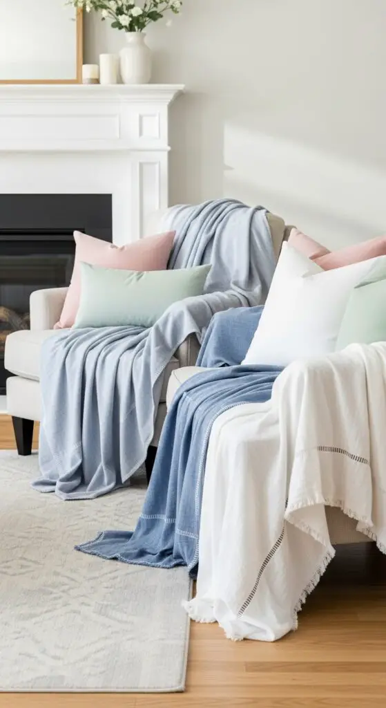 Cozy blankets become essential layering pieces that I drape strategically over chairs and sofas. I choose materials like chunky knits, soft throws, and lightweight weaves in spring colors. Natural elements like woven baskets, jute rugs, and wooden accessories add organic texture contrasts.