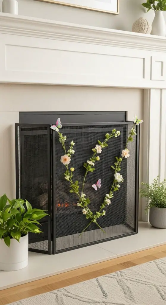 For personalized fireplace screens, I create custom arrangements matching my room’s color palette. Removable elements work best since they won’t damage the screen permanently. Small potted plants positioned strategically around the base complete the fresh, spring-inspired look I’m seeking.