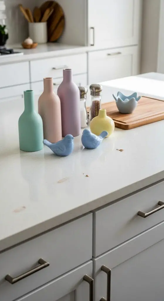 Pastel figurines work beautifully as accent pieces between everyday items like salt shakers and cutting boards. Choose ceramic birds in powder blue or small sculptural pieces in gentle yellow tones. These objects shouldn’t overwhelm your space—instead, they’ll add subtle spring charm that feels fresh and liberating after winter’s heavier decorative elements. For a cohesive look, focus on sleek designs that complement your kitchen’s existing aesthetic while bringing in those coveted spring vibes.