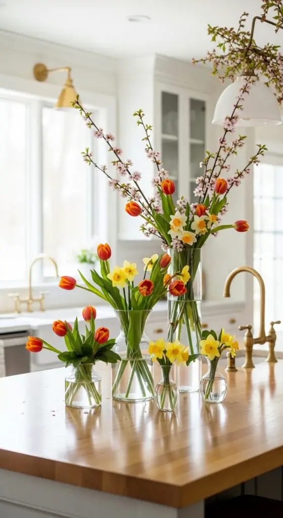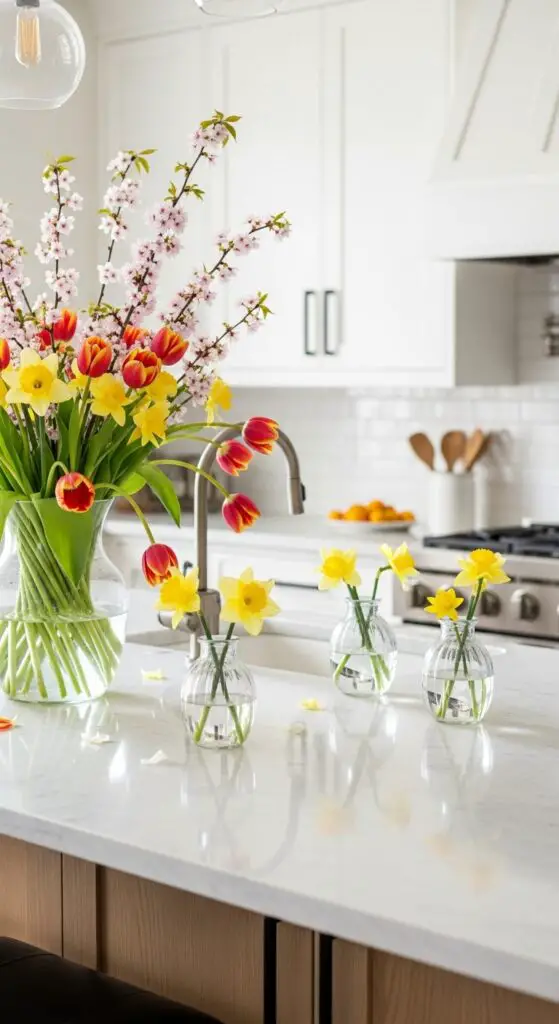Choose seasonal flower bouquets featuring tulips, daffodils, or cherry blossoms for authentic spring appeal. Position larger arrangements at one end of your island while scattering smaller bud vases throughout for balanced coverage.