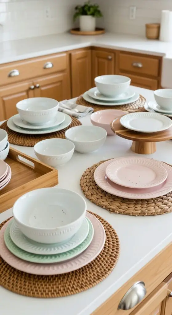Something magical happens when you swap out heavy, dark dishware for fresh ceramic pieces that capture spring’s lighter spirit. Display scattered dainty ceramics across your island’s surface, mixing white bowls with soft pastels like mint green or blush pink. Incorporate textured serveware through woven placemats, bamboo trays, or ceramic pieces with subtle raised patterns.