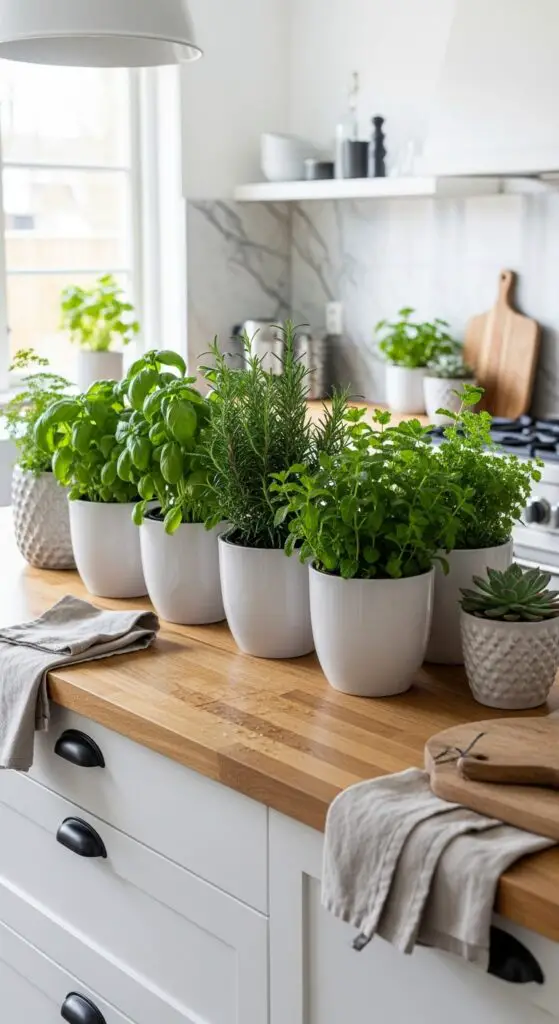Place potted plant accents like small ferns or succulents alongside your herbs for varied textures and heights. Choose containers that complement your kitchen’s color scheme, whether it’s white ceramics for farmhouse charm or sleek metal planters for modern appeal. The combination of wood, plants, and neutral tones creates a harmonious spring aesthetic that feels both fresh and timeless. This living decor alters your island into a dynamic, productive centerpiece.