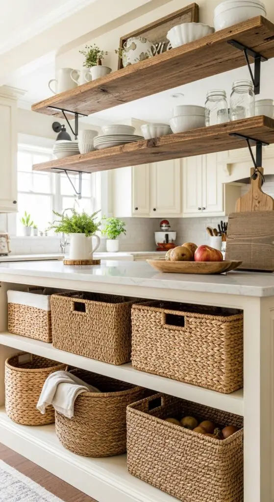 Woven basket storage creates functional organization while adding textural interest that feels both casual and sophisticated. Place medium-sized baskets under your island’s overhang for quick access to linens or produce. Mix different wood tones and weaving patterns to create visual depth without overwhelming your space’s natural springtime energy. Consider incorporating vintage touches like weathered wood signs or antique mason jars to enhance the rustic aesthetic.
