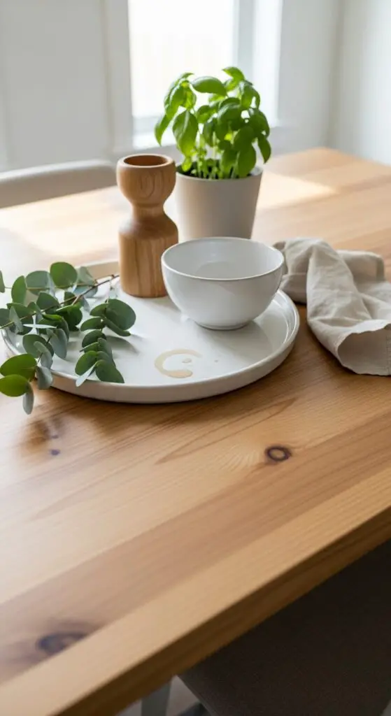 Fresh eucalyptus sprigs, white ceramic bowls, and natural wood accents work beautifully within neutral color palettes.