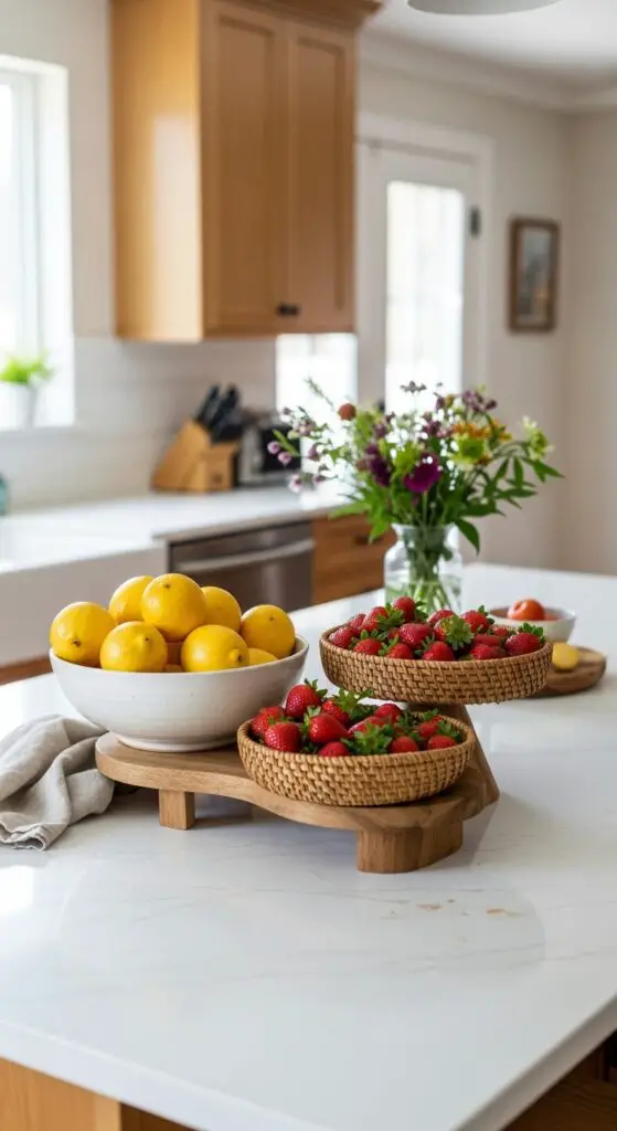 As spring’s bounty begins to fill markets and orchards, seasonal fruit displays offer an effortless way to bring energetic color and natural beauty to your kitchen island. I recommend creating layered fresh fruit bowls using varying heights and textures.