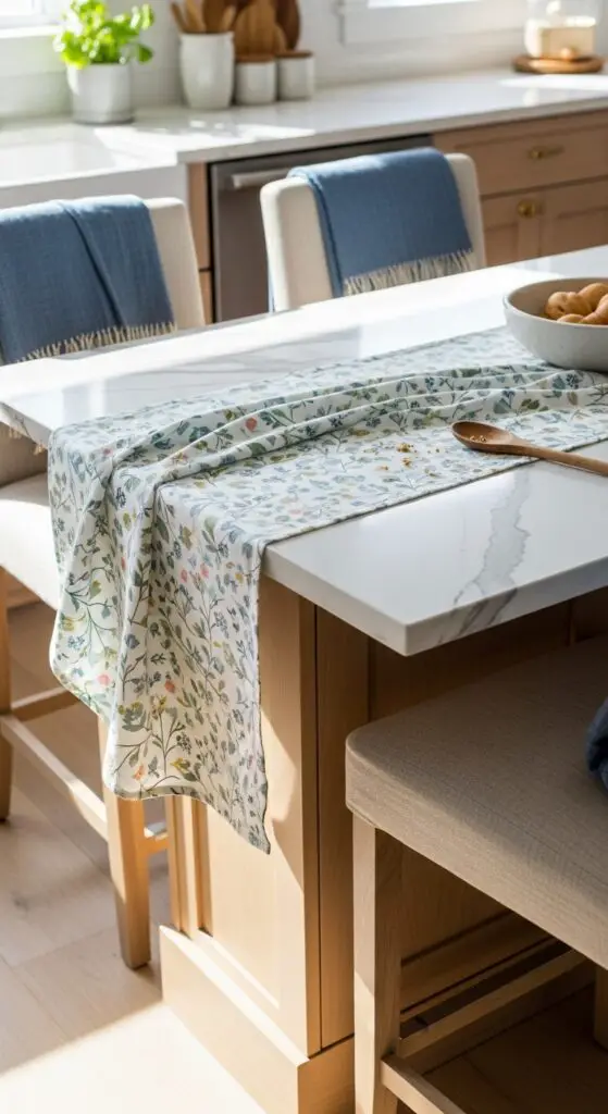 Choose seasonal table runners featuring botanical prints or cheerful stripes to define your island’s surface beautifully. Layer different textures like linen placemats under decorative bowls or fresh fruit displays. These affordable changes create visual interest without overwhelming your space, giving you the creative freedom to experiment with colors that reflect your personal style and seasonal preferences.