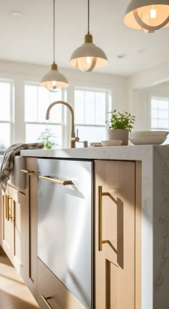 While subtle changes to your kitchen island’s hardware and fixtures might seem minor, they deliver stunning altering force that instantly brightens your entire space. I recommend you update cabinet hardware with brushed gold or polished chrome pulls that catch natural light beautifully.