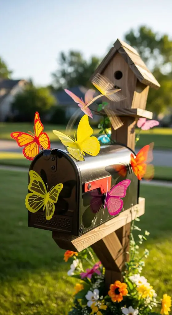 Consider mounting cheerful bird houses on nearby posts or directly above your mailbox for three-dimensional appeal. Add artificial flowers around the base to complete this nature-inspired design that alters transforms your ordinary mailbox into a whimsical fanciful garden focal point. To enhance the overall curb appeal, incorporate cozy accents like decorative signs or seasonal elements that complement your butterfly and bird theme.