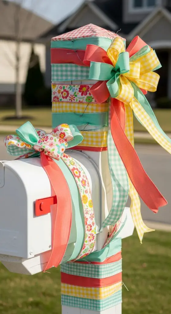 For added texture, create patterned fabric bows using floral or gingham prints that complement your home’s exterior. Attach these bows to your mailbox door or post using small wire ties.